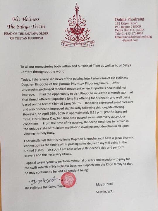 今天本人以沈重的心情向各位告知薩迦圓滿宮達欽仁波切趨入大涅槃的事情。 經過長期的醫療,仁波切的健康狀況並未改善。一個月前,我有機會於西雅圖拜訪仁波切,那時我向仁波切供養了上師寂忿長壽供養,仁波切表示欣然接受,而他的健康狀況也有明顯的改善。然而,於美西時間4月29日傍晚8:15尊貴的 達欽仁波切在種種的瑞象之下捨報,趨大涅槃,心融於法界。目前仁波切仍安住於甚深禪定之中,所有親見他法體的人無不生起廣大的虔敬心。