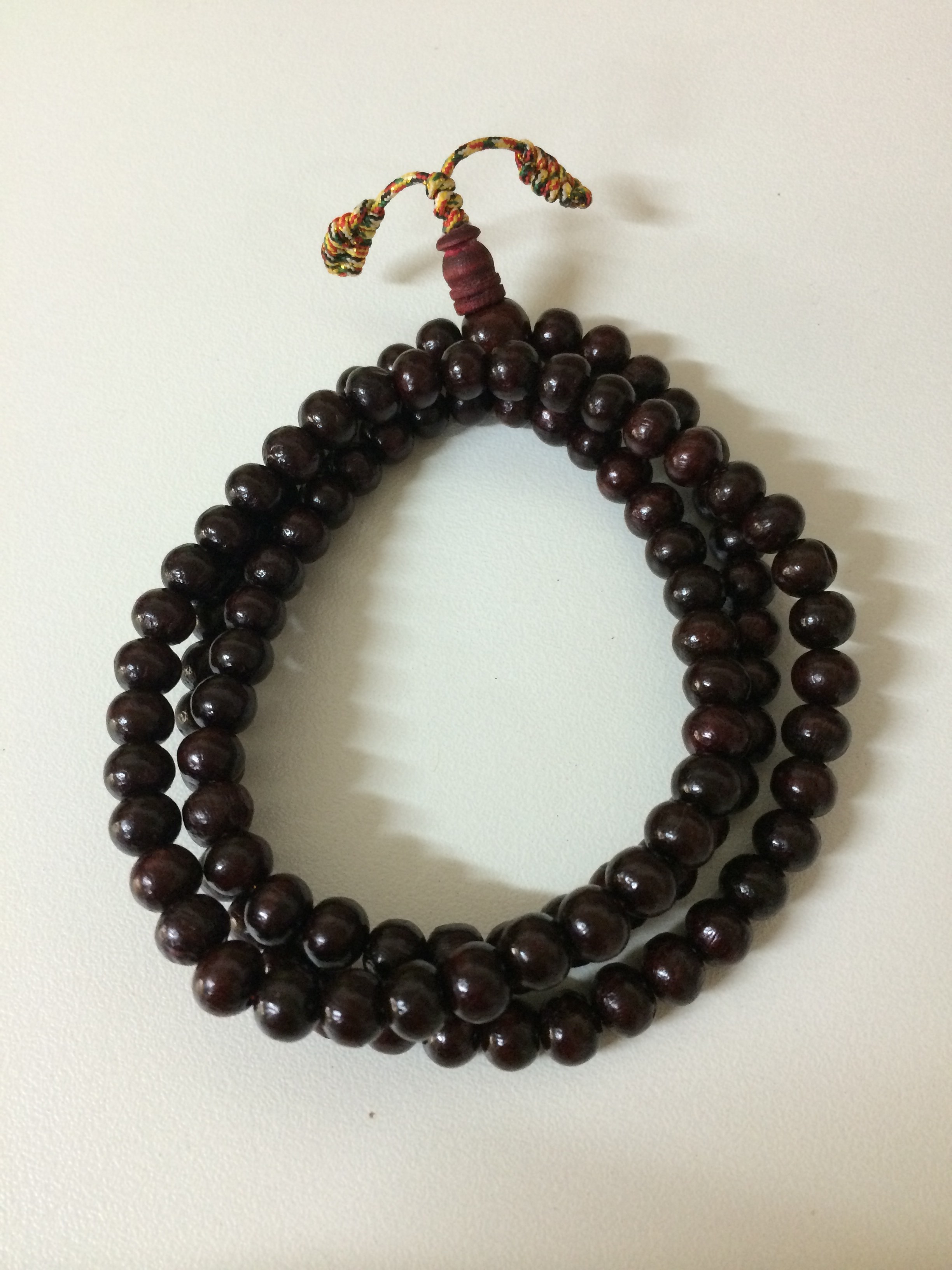 念珠的起源 念珠的梵文原語有四種, 譯成中文意思是: 數珠, 珠鬘, 念誦鬘, 珠之貫線, 印度人自古都有以瓔珞鬘條纏身之風俗, 亦是後來演變成念珠的使用。不過佛教最初是沒有使用念珠, 最早有記載約是二世紀, 而中國則在隋唐時代(公元六百年左右)開始有記載使用念珠及在雕刻佛像時亦有刻上念珠。念珠不是佛教所創, 在佛陀時代所制的律儀亦無念珠的記戴, 亦不包括在「比丘十八物」中。 而佛經記戴念珠多出於後期的經典, 而律部經典卻不見有記戴, 所以依律典的南傳佛教徒亦較少有持珠, 但在密教中念珠卻是極受重視。